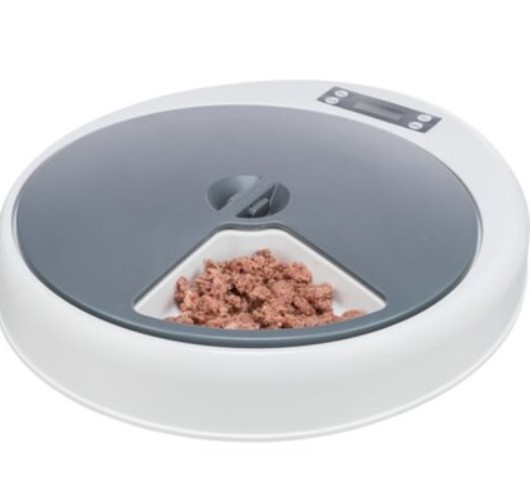 Den bästa automaten för våtfoder vi testat är Foderautomat TX4. Faktum är att man kan använda Foderautomat TX4 för att portionera ut våtfoder såväl som torrfoder. Söker man därför en automatisk lösning för både våtfoder och torrfoder kan detta vara bästa lösningen. Det ska dock sägas att kapaciteten är betydligt lägre än för en vanlig torrfodermaskin. Om man söker en lösning som kan portionera ut torrfoder dagligen är det bättre att överväga en renodlad maskin för ändamålet. TX4 innehåller 4+1 stycken fack som man kan fylla på med valfri mat. Maskinen snurrar sedan den inre skivan för att tillgängliggöra de olika facken för katten, en i taget. Man kan själv programmera när katten ska matas. Ett fack rymmer maximalt 240 ml mat.