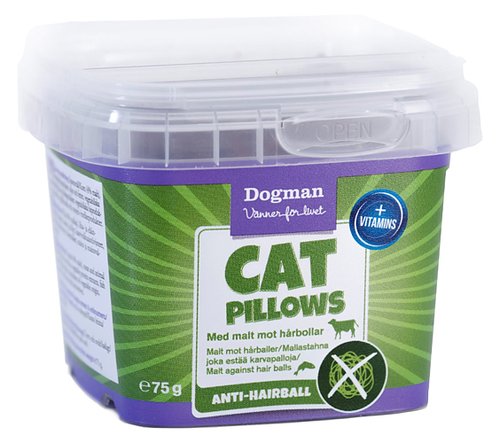 Cat pillows Anti-hårboll är det bästa kattgodiset mot hårbollar vi testat. Denna produkt hjälper katten med matsmältningen och hindrar att hårbollar ställer till med problem i tarmsystemet. Detta är läckra bitar med frasigt yttre och med en maltkräm på insidan som katten älskar. Denna produkt är dessutom berikad med bland annat med A- och E-vitamin. En fördel med dessa burkar från Dogman är även att de låter mycket när man skakar på dem vilket gör att man kan locka till sig katten även om den befinner sig utomhus.