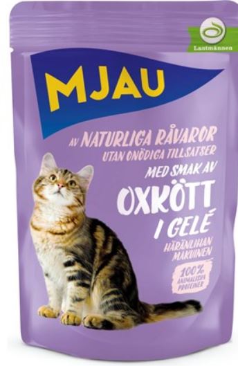 Mjau är ett säkert och välbeprövat svenskt kattmatsmärke som är en favorit hos oss som gör Husdjursgalen. Kattmaten kommer i olika utföranden men vår favorit är de praktiska portionspåsarna. Enligt vår erfarenhet hinner kattmaten ofta bli dålig om man köper större burkar. På så sätt sparar man ändå pengar på att använda dessa portionspåsar. Denna produkt innehåller inte tillsatser av spannmål eller socker. Den är rik på det nödvändiga taurinet samt har en bra halt av protein och fett.