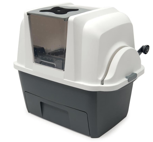 Detta är en kattlåda som tack vare dess inbyggda rengöringsprocess gör rengöring av kattlådan till en mycket enkel uppgift för oss kattägare. Genom att endast dra i den mekaniska spaken, som sitter på utsidan av kattlådan, så sätter man igång en process som rengör och städar upp i kattlådan. När man drar i spaken så kommer sand börja cirkulera i lådan. I denna process så tas klumparna omhand och förvaras i en låda som sedan kan tömmas. Den rena sanden cirkuleras sedan tillbaka in i kattlådan igen. Tack vare lådans effektiva process så behöver man inte slösa på sand. Den sandbesparande processen är bra både för plånboken och för miljön.